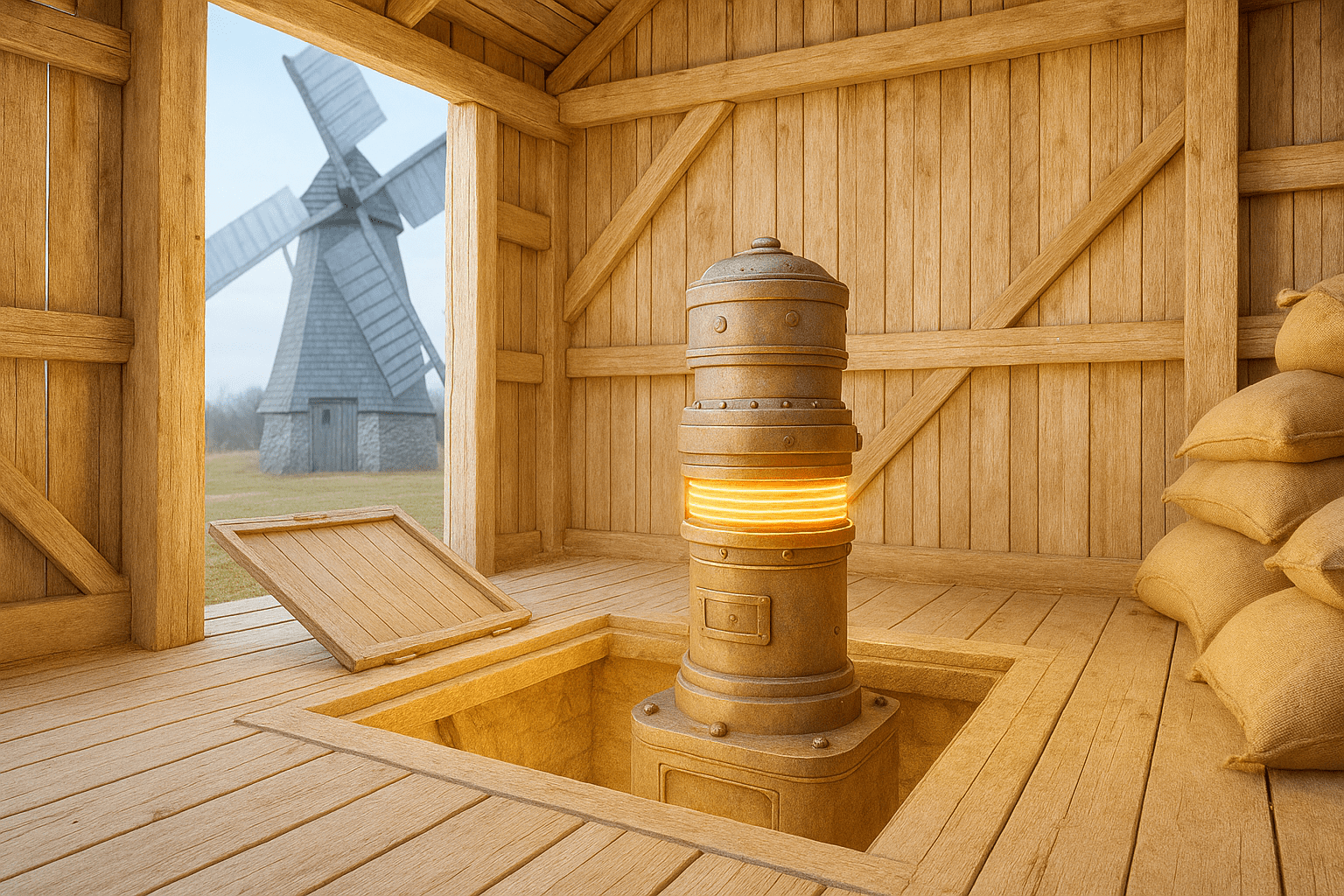 Instead of the usual clatter of old gears, he heard a steady, mechanical hum. A vibration ran through the wooden floorboards, rhythmic and precise. Samuel followed the sound to a hatch in the floor he had never seen before—hidden beneath sacks of seed and loose boards.
